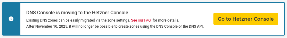 Ich bin seit vielen Jahren Kunde bei Hetzner (beruflich wie privat). Und wie oft gehe ich in die WebUI von Hetzner Robot, die DNS-Konsole oder in die Hetzner Console (ehemals Hetzner Cloud)? Antwort: Nicht so oft. Es läuft ja alles und selbst neue VMs kann ich über die API erzeugen. Warum soll ich mir das dann zusammen klicken. Das ist aber genau so lange voll OK, bis es eine wesentliche Änderung gibt, die mir dann über die Bubble zugespielt wird: Ey … haste mitbekommen … die schalten die DNS Console ab. 😳
