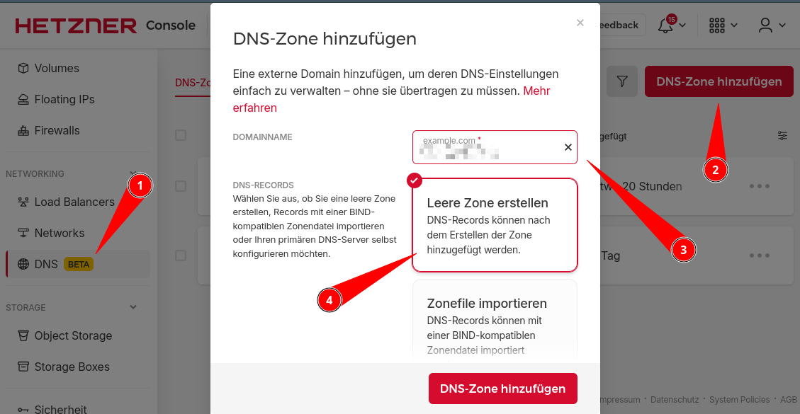 Schritt 1 - Zonen-Datei anlegen: In der Hetzner-Console muss in dem entsprechenden Projekt unter DNS (1) eine DNS-Zone mit der neu erworbenen Domain hinzu gefügt werden (2). Im Formular trägt man den gewünschten Domainnamen (3) ein. Für den Test reicht eine leere Zone (4):