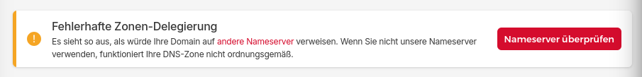 Schritt 2 - Fehler beseitigen: Ein reiner Klick auf “Nameserver überprüfen” bringt hier nichts. Es muss noch im Hetzner Robot, bei den Domains 1x auf “Domain ändern” geklickt werden. Aktualisiere ich dann die Seite, ist die oben erwähnte rote Fehlermeldung weg. Zudem wird die Korrektur via Mail bestätigt. Erst im Anschluss führt der Klick in der Hetzner Console “Nameserver überprüfen” das gewünschte Ergebnis und die Meldung verschwindet.