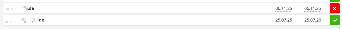 … und eine Fehlermeldung (per Mail und in der GUI) wenn ich dann die Domain “zahlungspflichtig registriert” habe. Im Robot wird das auch schön dargestellt (Weißes Kreuz auf rotem Grund rechts im Bild):
