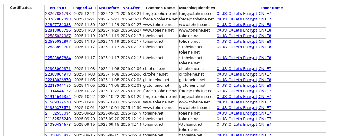 Um die CT Logs einzusehen gibt es Tools wie z. B. crt.sh . Das war mir auch komplett neu. Hier sind pro Domain alle bisher ausgestellten Zeritifikate hinterlegt. Ich bin fasst vom Stuhl gefallen, als ich gesehen hab, was man hier alles ablesen kann: