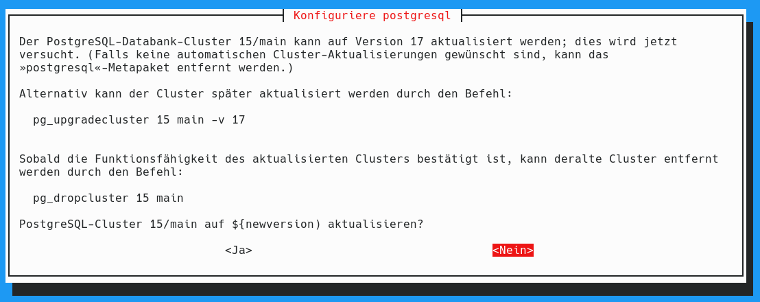 Gestern hab ich Wartungsarbeiten auf einem Peertube-Server durchgeführt. Dieser verwendet im Hintergrund eine PostgreSQL-Datenbank. In diesem Zusammenhang hab ich auch das darunter liegende Debian auf die Version 13 (Trixie) aktualisiert. Dabei wurde auch die PostgreSQL Datenbank von 15 auf Version 17 aktualisert. Mittlerweile geht das ja wirklich gut von der Hand, aber wenn ich nachfolgende Warnmeldungen sehe, bin ich immer etwas skeptisch.
